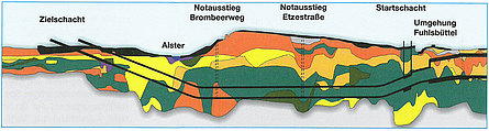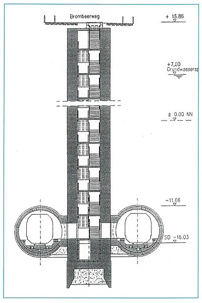 Ab 2007 wird der Hamburger Flughafen Fuhlsbüttel an das S-Bahn-Netz im Großraum Hamburg angeschlossen sein, die Anbindung erfolgt unterirdisch vom Stadtteil Ohlsdorf aus. Die beiden je 1750 m langen Tunnelröhren werden in Sand, Feinsand und Geschiebemergel mit einem Hydroschild aufgefahren. Im Bereich des Zielschachtes beträgt die minimale Überdeckung 4 m, die größte Überdeckung erreicht 35 m zwischen den Notausstiegen Brombeerweg und Etzestraße. In weiten Bereichen verläuft die Trasse unter Bebauung, zudem werden die Alster und eine Bahnanlage unterquert. Als maximaler Wasserdruck stehen 3,0 bar an. Der Tunnelausbau besteht aus gekoppelten Tübbingringen im Topf-Nocke-Design mit einer Breite von 1,50 m und einer Dicke von 40 cm. Der Tübbing wird mit konventioneller Bewehrung hergestellt. Zum Schutz gegen Abplatzungen im Brandfall wird in den Tübbing zusätzlich innerhalb der Betondeckung eine verzinkte Brandschutzmatte eingelegt. Der Einbau des Masse-Feder-Systems einschließlich des Gleises im Tunnel erfolgt unmittelbar nach der Fertigstellung der jeweiligen Tunnelröhren . Die beiden Notausstiege werden in Caissonbauweise automatisiert erstellt. Die Caissons werden bis zur Endposition in 40 m Tiefe erstmals rein maschinell schrittweise abgesenkt. Das Abteufen erfolgt je nach geologischen Verhältnissen im Spül- oder im Baggerbetrieb. Bei beiden Verfahren erfolgt die Steuerung automatisch, ein Einsatz von Personal unter Druckluft ist nicht erforderlich. Der Anschluss an die Tunnelröhren erfolgt mithilfe einer Baugrundvereisung. Weiterhin ist ein 1 08 m langer Tunnel in offener Bauweise zu erstellen, der die mehrspurige Umgehungsstraße zum Flughafen Fuhlsbüttel unterquert. Die Verbauwände werden zum größten Teil in der Schlitzwandbauweise ausgeführt. Der Bodenaushub erfolgt abschnittsweise und überwiegend unter Wasser. Nach Einbau der Sohlanker wird eine Unterwasserbetonsohle hergestellt. Der Rohbau der 2-zelligen rechteckigen Tunnel erfolgt in offener Bauweise mit abschließender Verfüllung und Wiederherstellung der Oberfläche. Neben den Vereisungsmaßnahmen im Bereich der Querschläge werden umfangreiche Bodenstabilisierungen mit dem Düsenstrahlverfahren vorgenommen. Zur Sicherung der Tunnelvortriebsarbeiten erfolgt im Bereich des Start- und Zielschachtes ein Bodenaustausch.