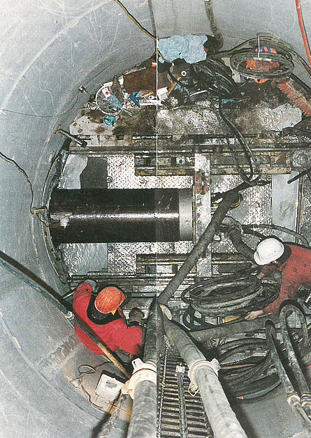 Die schwierigen Randbedingungen erforderten eine äußerst sorgfältige Arbeitsvorbereitung. Für eine erfolgreiche Abwicklung der Baumaßnahme mussten insbesondere die Vortriebskräfte, die Verrollung des Bohrkopfes und die Laserrefraktion, beachtet werden. Mit dem Einsatz eines ELS-Systems wurden die Haltungen absolut exakt aufgefahren. Dadurch konnten in Verbindung mit dem verwendeten Rohrmaterial die Vortriebskräfte während der Bauausführung auf 100 kN reduziert werden. Um eine mögliche Verrollung des Rohrstranges zu verhindern, wurden die ersten Rohre torsionssicher miteinander verbunden. Bei großen Haltungslängen mit kleinen Rohrdurchmessern kommt es im aufgefahrenen Rohrstrang häufig zu einer starken Wärmeentwicklung, die zu einer Refraktion des Lasers führen kann. Um eine Abweichung von vornherein zu vermeiden, wurde während des gesamten Vortriebs die erhitzte Luft am Bohrkopf abgesaugt und gegen Frischluft ausgetauscht. Insgesamt waren 6 Haltungen aufzufahren, für die 3 Pressgruben DN 3300 und 4 Zielgruben DN 2600 erforderlich wurden.
