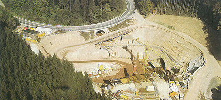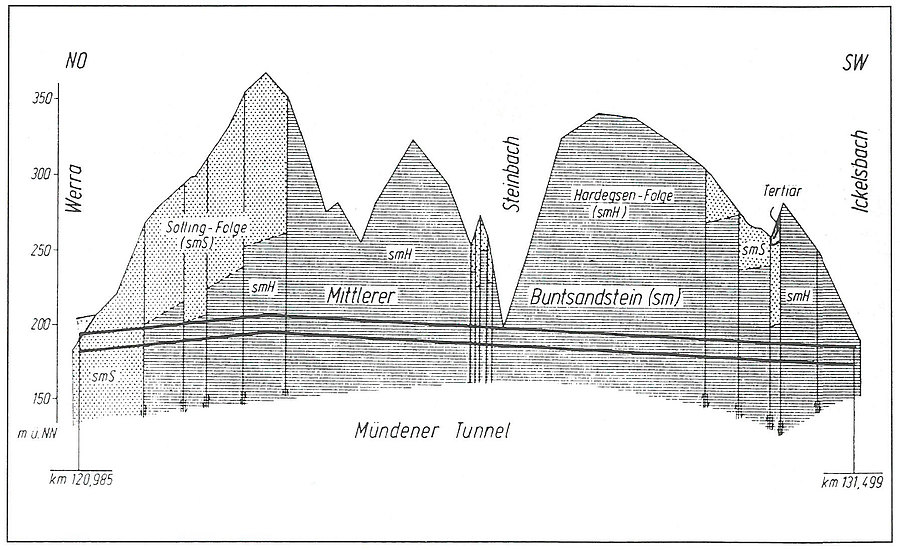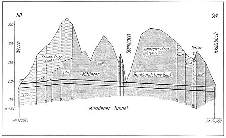 In der Nähe der Stadt Münden, südlich des tief eingeschnittenen Werratals direkt neben der Brücke der Autobahn A 7, folgt in Richtung Südwesten auf einen kurzen Voreinschnitt der Mündener Tunnel. Der nördliche Teil des Münden er Tunnels befindet sich im oberen Teil des Mittleren Buntsandsteins, der Solling-Folge und der Hardegsen- Folge. Es werden Verwerfungen und Störungen angefahren, an denen Verschiebungen im Dezimeter- bis Meterbereich stattgefunden haben. Das Gebirge ist gebräch bis druckhaft. Etwa auf halber Strecke des Mündener Tunnels befindet sich das Steinbachtal. Ursprünglich war vorgesehen, das Steinbachtal offen auf einer Spannbetonbrücke zu überqueren. Hierdurch hätten sich statt des langen Mündener Tunnels zwei kürzere Tunnel ergeben. Weil jedoch der Streckenabschnitt in einem Naturpark liegt, wurde auf Anregung Betroffener für das Steinbachtal eine Umplanung durchgeführt. Dabei wurde die Gradiente in diesem Bereich um etwa 35 m abgesenkt, um den Steinbach mit einem Tunnel bei minimaler Firstüberdeckung von etwa 2 m unterqueren zu können. Dies führte dazu, dass aus zwei kürzeren Tunneln ein langer Tunnel wurde. Der Vortrieb erfolgte von drei Seiten gleichzeitig. Etwa in der Mitte des Tunnels wurde im Steinbachtal ein Zwischenangriffspunkt geschaffen, von dem aus Vortriebe in nördlicher und südlicher Richtung liefen. Als max. Firstüberdeckung werden170 m erreicht. Die Vortriebsarbeiten begannen im April 1985. Von der Werra aus wurde auf ca. 500 m Länge ein Gegenvortrieb in der Kalotte durchgeführt. Der Zwischenangriffspunkt im Steinbachtal wurde als Notausgang und als Zugang für Zwecke der Instandhaltung ausgebaut. Die Sohle wird bis auf die Eingangsbereiche, in denen eine stark gewölbte Sohle erforderlich ist, mit einer flach gewölbten Aussteifung gesichert. Die Innenschale wird zum größten Teil 30 cm dick ausgeführt. Eine Kunststofffolie zwischen Innen- und Außenschale dichtet den Tunnel gegen Sickerwasser ab. Der gesamte südliche Abschnitt des Mündener Tunnels wurde in der Hardegsen-Folge des Mittleren Buntsandsteins aufgefahren. Der Vortrieb erfolgte steigend von Süd nach Nord. Die Vortriebsarbeiten begannen im Oktober 1983.