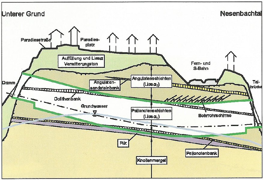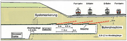 Die Ostumfahrung Vaihingen mit einer Gesamtlänge von 1,9 km schließt an die B 14 (Vaihinger Dreieck) an und verläuft beim Parkhaus Unterer Grund parallel zu den Bahngleisen. Im Osterfeldtunnel mit einer Länge von ca. 400 m werden die Paradiesstraße und die Eisenbahngleise der Gäu- und S-Bahn bergmännisch unterfahren. Das Nesenbachtal wird mit einer 170 m langen Brücke überquert. In der Fortsetzung verläuft die Straße auf der südlichen Talseite unterhalb der Höhenrandstraße im 780 m langen Hengstäckertunnel, der in offener Bauweise hergestellt wurde. Der ca. 400 m lange Osterfeld-Tunnel schließt an den Straßendamm im Unteren Grund an. Der Tunnel verläuft zunächst etwa parallel zu den Gleisen der Gäu- und S-Bahn bis auf Höhe der Don-Carlos-Brücke. Auf den ersten hundert Metern dieses Bereiches ist am Fuß des benachbarten Bahneinschnitts eine bis zu 9 m hohe Winkelstützmauer vorhanden. Außerdem liegen einige Wohngebäude im Einflussbereich des Tunnels, wobei ein Haus unmittelbar unterfahren wird. Hinter der Don-Carlos-Brücke unterquert der Tunnel den Einschnitt der viergleisigen Bahnstrecke im spitzen Winkel und endet kurz danach in der nördlichen Flanke des Nesenbachtales. Der Tunnelliegt zwischen 6 und14 m unter der Geländeoberfläche, wobei sich die geringste Überdeckung einer Unterquerung der Bahngleise ergibt. Als Tunnelquerschnitt kommt ein Maulprofil mit einer maximalen lichten Breite von 10,4 m und einer maximalen lichten Höhe der Innenschale von 8,9 m zur Ausführung. Die Dicke der aus WU-Beton bestehenden Innenschale beträgt im Regelfall 40 cm. Der Ausbruch des insgesamt 98 m² großen Tunnelquerschnitts erfolgte ausschließlich mit einem Tunnelbagger. Dabei wurde der Querschnitt in einen vorauseilenden Kalotten- und nachlaufenden Strossen-/ Sohlausbruch unterteilt. Aus statischen Gründen und im Hinblick auf eine Minimierung der Oberflächensenkungen erhielt die Kalotte eine temporäre Spritzbetonsohle. Der Abstand des Strossen-/ Sohlausbruchs zur Kalotte betrug mindestens 50 m. Die Abschlagslängen lagen beim Kalottenvortrieb zwischen 80 cm und 1,20 m, in der Strosse und Sohle zwischen 1,6 und 3,0 m. Sowohl beim Kalotten- als auch beim Strossen-/ Sohlausbruch wurde ein schneller Ringschluss der Spritzbetonschale hergestellt. Insbesondere bei der Haus- und Bahnunterfahrung hat sich dies als senkungsminimierende Maßnahme bewährt.