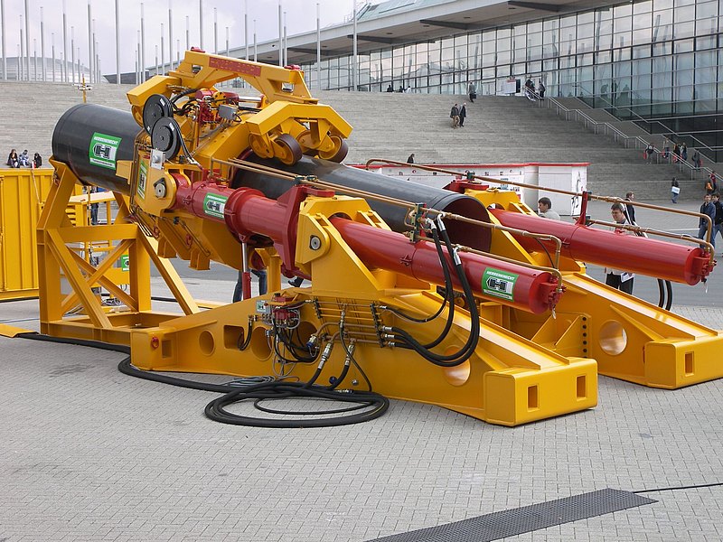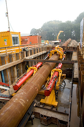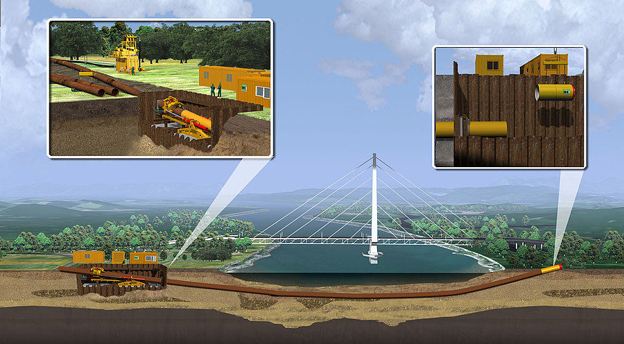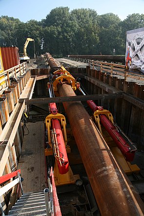 Die gewählte Trasse wurde insbesondere durch die Gesichtspunkte Einfluss auf Natur und Umwelt, günstige Leitungsanbindung an das Bestandsnetz sowie die Rohrstrangauslegung bestimmt. Nach Erkundung der Geologie, die im Wesentlichen durch Sand, Kies und Schluff gekennzeichnet ist, konnte das Projekt ausgeschrieben werden. Den Zuschlag erhielt ein Sondervorschlag, der den erstmaligen Einsatz des Direct-Pipe-Verfahrens vorsah. Dieses von der Herrenknecht AG und dem Ingenieurbüro Dr. Kögler neu entwickelte Verfahren überzeugte neben dem wirtschaftlichen Aspekt durch eine Minimierung der Bauzeit ein kalkulierbares Baurisiko, eine geringe Beeinflussung der Umwelt und die Nichtbeeinflussung des Rheinschifffahrtverkehrs. Dabei wurde ein auf der hessischen Rheinseite vorgefertigter Schutzrohrstrang in insgesamt sechs Rohrschüssen à 90 m grabenlos verlegt. Der Vortrieb erfolgte mit einer navigierbaren Direct-Pipe-Vortriebsmaschine, basierend auf dem Konzept der wassergestützten Ortsbrust. Der Abraum wurde über einen Spülkreislauf zur Separationsanlage gefördert und dort getrennt. Die eigentliche Neuerung: Der Pipe Thruster hat die Aufgabe, die vorgefertigte Pipeline nach vorne zu schieben. Über den Rohrstrang wurde die erforderliche Anpresskraft auf den Bohrkopf übertragen. Für die Vortriebszeit von 13 Tagen - bei einer Gesamtlänge der Strecke von 464 m - wurde aufgrund der gut ausgebildeten Ringraumschmierung eine durchschnittliche Schubkraft von lediglich 80 t gemessen (bei einer maximal verfügbaren Kraft des Pipe Thrusters von 500 t). Die minimale Überdeckung auf der Strecke beträgt 3m. Wesentlicher Vorteil bei diesem Verfahren war die einseitige Baustellenandienung über das hessische Vorland mit Standort der Vortriebsanlage und des auf eine aufgeschüttete Ablaufbahn auslegten Rohrstrangs. Für das Einbringen des Rohrbündels wurde eigens ein Verlegekonzept entwickelt. Die spätere Wasserleitung DN 600 diente hierbei als Trägersystem, an dem sternförmig vier Rollen und ein Schellensystem, das die übrigen Versorgungsleitungen aufnehmen konnte, angebracht waren. Nach Abschluss der Rohrarbeiten wurde der verbliebene Hohlraum mit Porenleichtbeton zur Lagestabilisierung und zum Korrosionsschutz aufgefüllt.