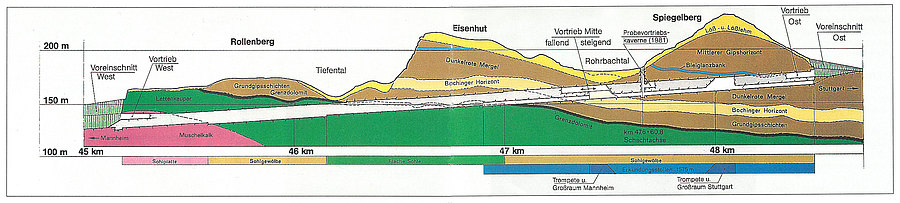Der Tunnel durchfährt steigend von Nordwesten nach Südosten die Formation des Muschelkalks, des Lettenkeupers sowie anschließend im Gipskeuper die Grundgipsschichten, den Bochinger Horizont und die Dunkelroten Mergel. Aufbau: Muschelkalk: sehr harter Kalkstein und Dolomit. Lettenkeuper: grauschwarze harte Tonsteine mit Einschaltung dickbankiger Dolomite und Sandsteine. Grundgipsschichten: feinblättrige bis dünnbankige Schlufftonsteine unterschiedlichen Verwitterungsgrades. Dunkelrote Mergel: dünn- bis mittelbankige Schlufftonsteine. Los 1: Querschnittsgröße der 3-gleisigen Anfahrstrecke und Durchfahrung des Tiefentals mit nur 6 m Überdeckung. Los 2: Schwierige felsmechanische und hydrogeologische Verhältnisse, die den Einsatz eines Erkundungsstollens sowie einen Probevortrieb in der Kalotte des späteren Tunnels erforderten. Ausführung: Ausbruch und Sicherung nach der Spritzbetonbauweise, unterteilt in Kalotte, Strosse und Sohle. Vortriebe Mitte und Ost, Ausbruch mit Tunnelbagger Vortrieb West, Sprengausbruch Herstellung der Innenschale aus wasserundurchlässigem Stahlbeton. Je nach Gebirgs- und Wasserverhältnissen weist der Querschnitt ein Sohlgewölbe, eine flach gewölbte Sohle oder eine Sohlplatte auf. Das Westportal im Bereich der 3-gleisigen Strecke weist eine Innenschalendicke von 1,20 m auf. In der anschließenden Trompete mit der Verjüngung auf die 2-gleisige Regelstrecke verringert sich die Auskleidungsstärke stufenweise bis auf die Regel-Innenschalendicke von 40 cm. Das 2-gleisige Ostportal besitzt eine Innenschalendicke von 80 cm. Rohbauleistungen: