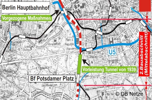 Der 2. Bauabschnitt schließt vom Hauptbahnhof an den 1. BA der S21 an und am Kreuzungsbauwerk der Nordsüd-S-Bahn an die Abstellanlage der Station Potsdamer Platz.