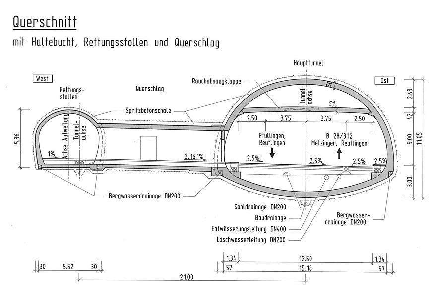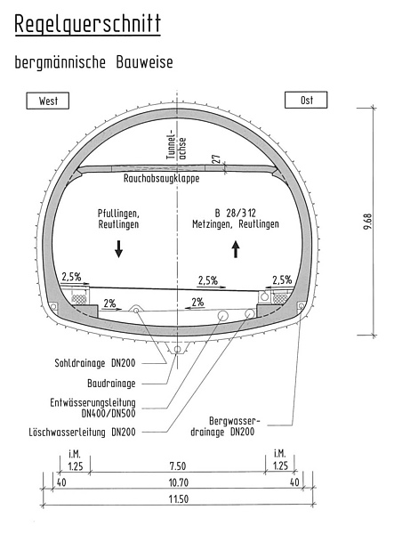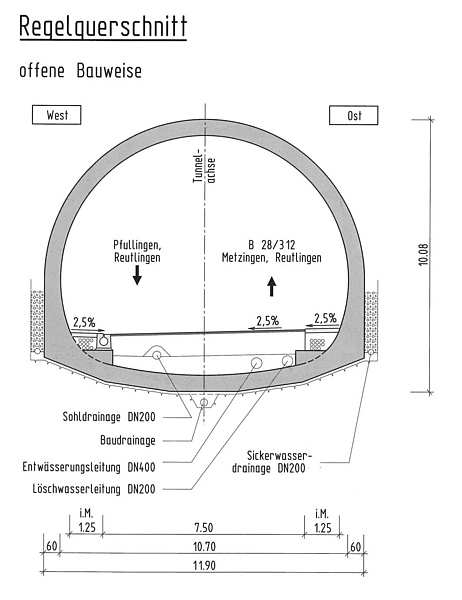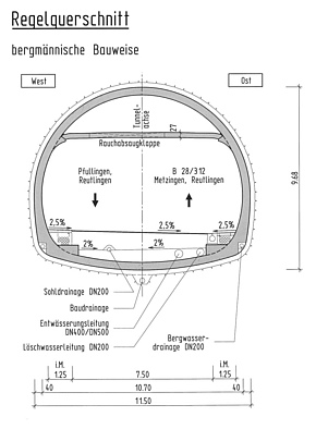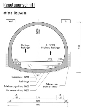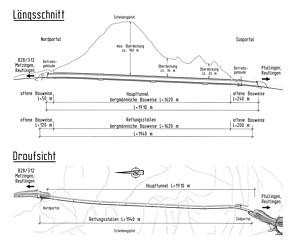 - Gesamtlänge: 1.910 m (davon 290 m offene Bauweise); 1.940 m (Rettungsstollen)