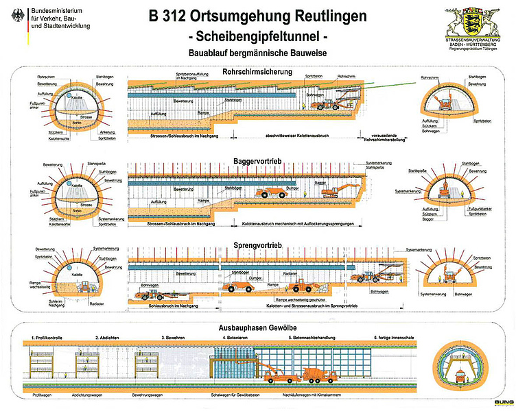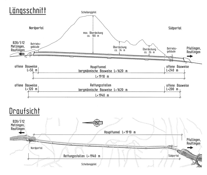 Die Bundesstraße 312 verbindet die A 7 bei Memmingen mit der A 8 bei Stuttgart. Sie stellt eine wichtige regionale Verkehrsachse zwischen Stuttgart, Reutlingen, der schwäbischen Alb und dem oberschwäbischen Raum dar. Die B 312 ist ein bedeutender Albaufstieg, bereits zu Beginn des 19. Jahrhunderts wurde in diesem Bereich eine Straße gebaut. In Reutlingen führte die Bundesstraße durch die Innen- Stadt, das hohe Verkehrsaufkommen von bis zu 65.000 Kraftfahrzeugen/Tag bedeutete für die Einwohner eine erhebliche Lärm- und Schadstoffbelastung. Bereits in den 1960er Jahren gab es erste Überlegungen zum Bau einer Ortsumgehung für Reutlingen. In den 1990er Jahren wurde das Baurecht für die „Umgehungsstraße Scheibengipfeltunnel" im Rahmen eines Bebauungsplanverfahrens geschaffen. Nach Abschluss eines ergänzenden Planfeststellungs- Verfahrens, welches aufgrund einer technisch bedingten Erweiterung der Tunnelbaumaßnahme notwendig wurde, konnte mit dem Bau der Ortsumgehung Reutlingen im Jahr 2009 begonnen werden. Das Kernbauwerk der 3,1 km langen östlichen Umfahrung Reutlingens ist der mehr als 1,9 km lange Scheibengipfeltunnel. Er stellt eine Nord-Süd-Verbindung zwischen der B 28 und der B 312n her. Der Tunnel unterquert den Scheibengipfel- Höhenrücken neben dem Hausberg der Stadt Reutlingen, der Achalm. Die Tunnelüberdeckung variiert zwischen 20m- 40 m im Bereich des Wohngebietes an der Achalm und einer maximalen Überdeckung von ca. 100 m.