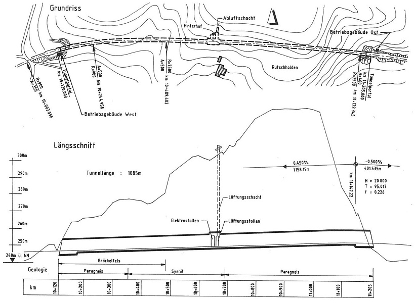 Die Trasse des im bergmännischen Ausbruch herzustellenden Tunnelbauwerkes führt durch ein vielfältiges Gebirge. Paragneis und Syenit stellen dabei die häufigsten Gesteine dar. Die meist dunklen, massigen und mittelkörnigen Syenitgesteine, die an weitständigen tektonischen Trennflächen zerlegt sind, bilden über ca. 320 Meter den zentralen Abschnitt im Tunnel. Westlich und östlich des genannten zentralen Abschnittes herrschen Paragneise vor. Sie sind ebenfalls meist dunkle, aber im Gegensatz zum Syenit gebänderte Gesteine. In der Schieferungsebene sind vereinzelt Amphibolite und Kalksilikate eingeschaltet. Der tektonische Kontakt zwischen Syenit und Paragneis erfolgt auf beiden Seiten über Störungszonen von bis zu 20 m Mächtigkeit.