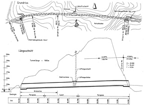 Die im Einklang mit dem anstehenden Gelände unter ca. 30° recht flach angeschnittenen Tunnelportale haben einen Kragen, dessen Laibungsfläche in aufsteigender Richtung von rd. 0,70 m auf 1,60 m zunimmt und die in ihrem Scheitelpunkt um 20° aus dem Lot heraus nach außen geneigt ist. Der Kragen ist durch parallel zur Scheitelneigung eingelegte Kragenleisten von 3 x 6 cm strukturiert.