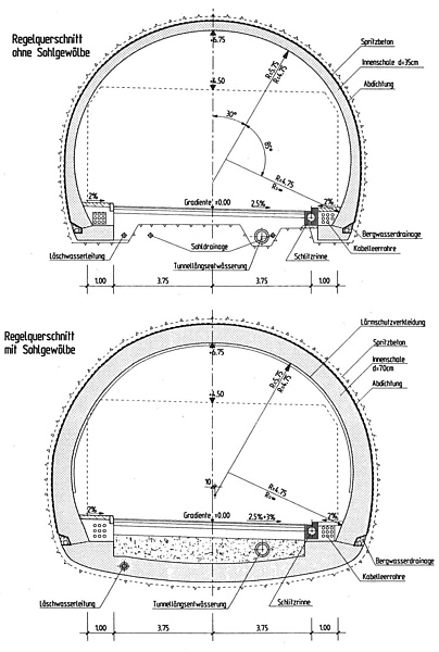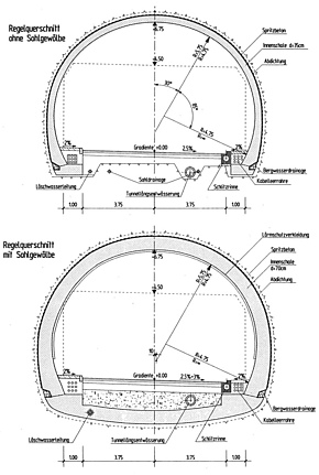 Der Tunnel wurde in seiner gesamten Länge nach der „Neuen Österreichischen Tunnelbauweise" (NOT) bergmännisch aufgefahren. Dem Ausbruch folgend wurde eine Spritzbetonschale als Erst- Sicherung eingebaut, die mit Tunnelbogen und Betonstahlmatten, ggfs. auch mit Ankern verstärkt wurde.