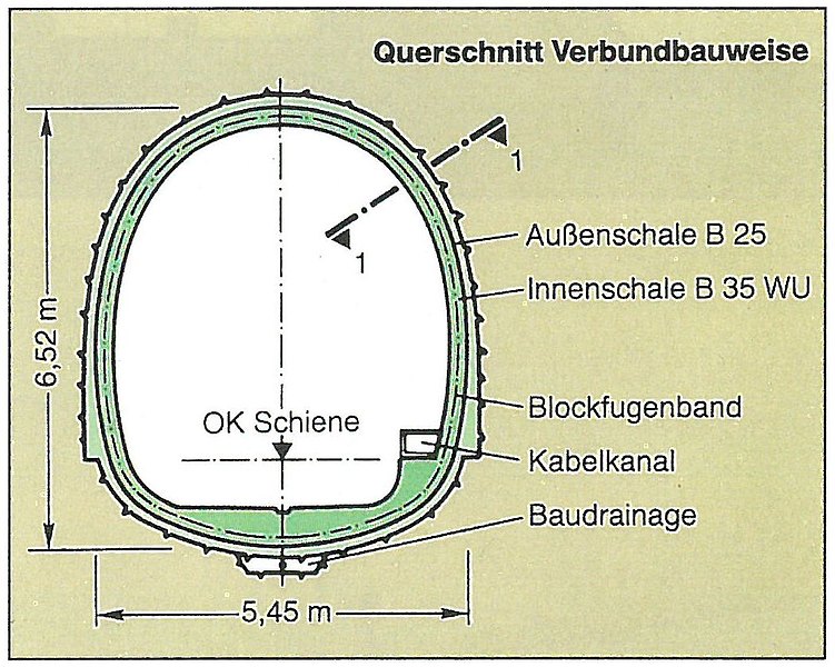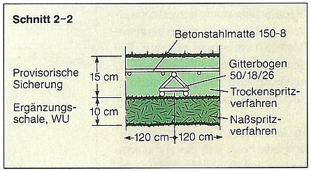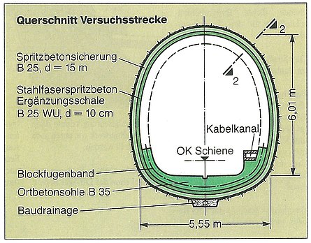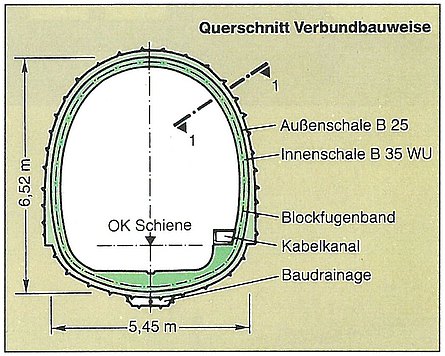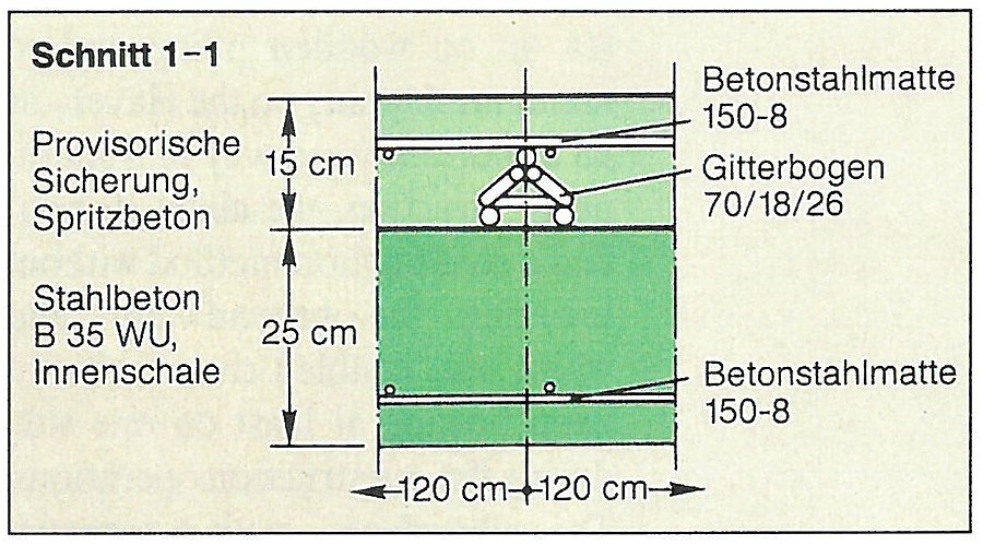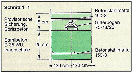 - Auskleidung: Spritzbeton mit Stahlfasern; optional eine Ortbetoninnenschale