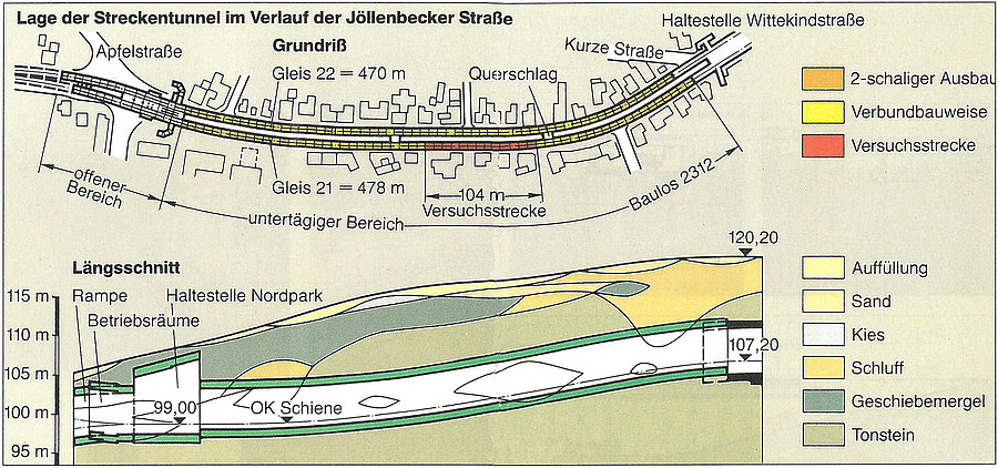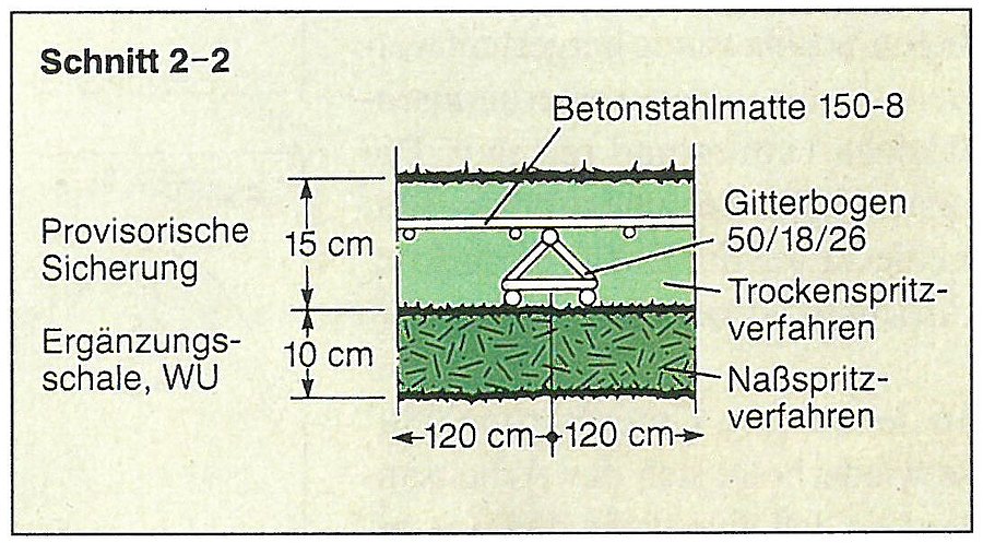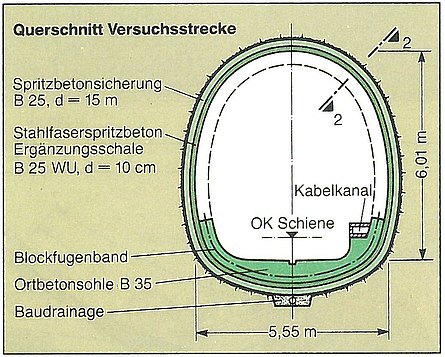 Unter Berücksichtigung der besonderen geologischen Randbedingungen (Lage im festen Tonstein, günstiges Primärspannungsverhalten), der hohen Überdeckung (> 1 d) und der städtebaulichen Situation lag es nahe, den Versuch einer "einschaligen Bauweise" zu unternehmen. In Abstimmung mit dem Zuschussgeber und den beteiligten Gutachtern wurden ein 104 m langer Streckenteil ausgewählt, die entsprechenden Vorgaben formuliert und als Teil der Ausschreibung dem Wettbewerb unterworfen. Die "einschalige Bauweise" besteht aus zwei Lagen, wobei die äußere Lage der Spritzbetonaußenschale der Verbundbauweise entspricht. Darauf wurde eine fugenlose Ergänzungsschale im Nassspritzverfahren aufgebracht. Diesem Spritzbeton der Güte B 25 wurden 70 kg Stahlfasern (Typ Wirecon, Ø 0,6 mm, l= 24 mm) pro m³ Beton beigemischt. Zur Abbindebeschleunigung des Betons und zur Verbesserung der Wasserundurchlässigkeit wurden je zur Hälfte der Versuchsstrecke zwei verschiedene Wege beschritten: Einmal wurde dem Beton synthetisches, pulverförmiges Siliciumdioxyd (14 kg/m³), im anderen Falle flüssiges Aluminat als Beschleuniger (19 kg/m³) und zusätzlich Microsilica (20 kg/m³) in einer Suspension zugegeben. Um eine fugenlose Schale zu gewährleisten, wurde der Stahlfaserspritzbeton kontinuierlich fortschreitend aufgebracht. Die Arbeiten wurden durch zahlreiche Eignungs- und Güteprüfungen begleitet. Die Versuchsstrecke erhielt eine Stahlbetonsohle, als Vorsorgemaßnahme für eine bei Bedarf später einzubauende Ortbetoninnenschale.