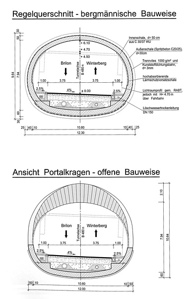 Die Entwässerungsanlage besteht aus einer Schlitzrinne, durch die das Wasser über Querleitungen und Kontrollschächte zur Tunnellängsentwässerung (DN 300) unter der Fahrbahn gelangt. Von dort führt sie zu einem separaten Havariebecken. Die Größe des Havariebeckens ist auf einen Havariefall mit ca. 72 m3 Löschwasser und 30 m3 Tankinhalt eines Lkw ausgelegt. Die Streckenentwässerung DN 500 wird geschlossen, ohne Zulauf, durch den Tunnel geführt und endet in einem benachbarten Leichtflüssigkeitsabscheider.