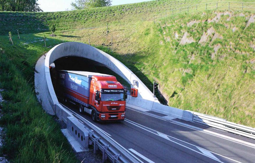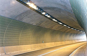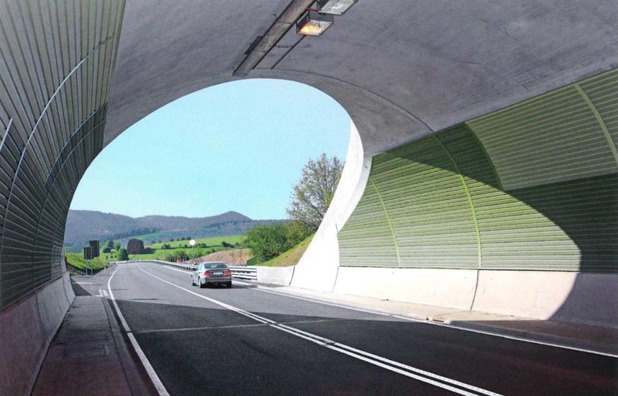 Aus Gründen des Lärmschutzes ist der Tunnel auf seiner gesamten Länge mit hochabsorbierenden Aluminium-Paneelen verkleidet.