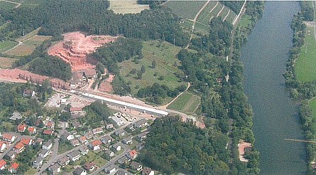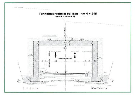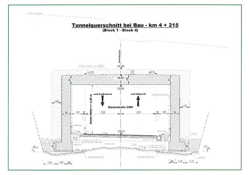 Zur Entlastung der Ortsdurchfahrten von Miltenberg und Bürgstadt war die Verlegung der Staatsstraße 2309 erforderlich. Das Staatliche Bauamt Aschaffenburg hat die 4,8 km lange Neubaustrecke der Ortsumfahrung im Zuge eines Public-Private-Partnership- Modells (PPP) an einen Generalunternehmer vergeben. Auf Grundlage eines Funktionalbauvertrags wurden dabei der Bau, die Erhaltung auf 25 Jahre sowie die private Vorfinanzierung der gesamten Strecke sowie aller darin enthaltenen Ingenieurbauwerke übertragen. Die Ortsumfahrung durchschneidet den Gefahrenbereich eines unmittelbar angrenzenden Natursteinwerks. Zum Schutz des Straßenverkehrs vor Auswirkungen des Sprengbetriebes im dazugehörenden Steinbruch wurde deshalb an dieser Stelle der Tunnel Miltenberg-Großheubach errichtet. Im Januar 2006 wurde mit dem Ausbruch der rd. 400 m langen und bis zu 18 m tiefen Baugrube für den Tunnel in offener Bauweise begonnen. Rd. 40 000 m³ Felsmaterial konnten im herkömmlichen Abbauverfahren mit schweren Baggern aus dem Fels gebrochen und mit Felsmeißeln zerkleinert werden. Das Ausbruchmaterial wurde danach in Dämmen und Bodenaustauschbereichen innerhalb der Strecke der Ortsumfahrung mit schwerem Walzengerät wieder eingebaut. Noch während der Felsausbrucharbeiten wurde am Tunnelportal Ost (an der Hangkante zum Main im Anschluss an die neue Mainbrücke) mit dem Bau des ersten Tunnelabschnitts begonnen. Mittels Schalwagen wurden im Wochentakt jeweils 10 m lange Abschnitte des Tunnelrahmens geschalt, bewehrt und betoniert. Im März 2007 war der Rohbau des 350 m langen Tunnels abgeschlossen. Anschließend wurde die bis zu 7 m hohe Überdeckung auf dem Tunnel aufgebracht. Der einbahnige Tunnel Miltenberg- Großheubach ist 350 m lang. Die lichte Weite des Tunnelquerschnitts beträgt 9,50 m, die lichte Höhe 4,50 m. Die Fahrbahn ist 7,50 m breit. Die Gradiente fällt vom West zum Ostportal durchgehend mit ca. 2,7%. Für den sicheren Betrieb des Straßentunnels sind betriebstechnische Einrichtungen wie Beleuchtung, selbstleuchtende Markierungselemente, Fluchtwegkennzeichnung, eine Tunnelfunkanlage, eine Brandmeldeanlage mit ergänzenden Sichtweitenmessgeräten und Notrufsäulen mit Feuerlöschern sowie Löschwasserentnahmestellen an den Tunnelportalen installiert. Jeweils vor den Portalen ist eine Nothalte- und Pannenbucht angeordnet. In den Portalvorfeldern sind zur Sicherung des Verkehrsablaufs verkehrstechnische Einrichtungen mit Wechsellichtzeichen und Wechselverkehrszeichen aufgestellt. Besonderes Augenmerk wurde im Zuge der Ausschreibung auf eine architektonisch ansprechende Gestaltung der Tunnelportale gelegt.