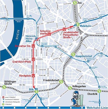 Die neue 3,50 km lange zweigleisige Tunnelstrecke mit insgesamt 5 Bahnhöfen und 2 Oberflächen-Haltestellen verläuft unterirdisch vom S-Bahnhof Bilk bis zum S-Bahnhof Wehrhahn und folgt im Wesentlichen den Straßenzügen Elisabeth-/ Kasernenstraße sowie Schadowstraße/ Am Wehrhahn. Die Tunnel sind 1.298 m und 955 m lang und haben einen Ausbruchsdurchmesser von 9,49 m.