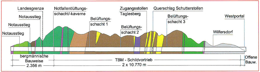 - Gesamtlänge: 2 x 1 0 770 m maschineller Vortrieb, 2356 m konventioneller Vortrieb