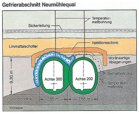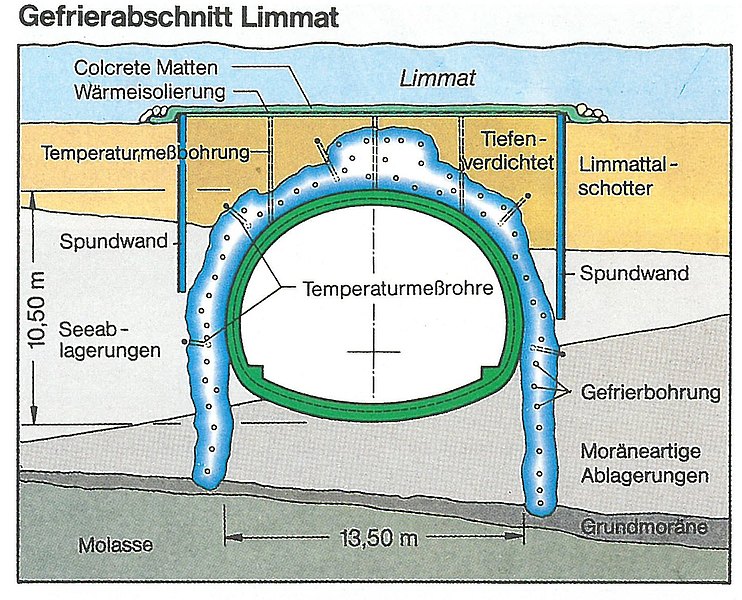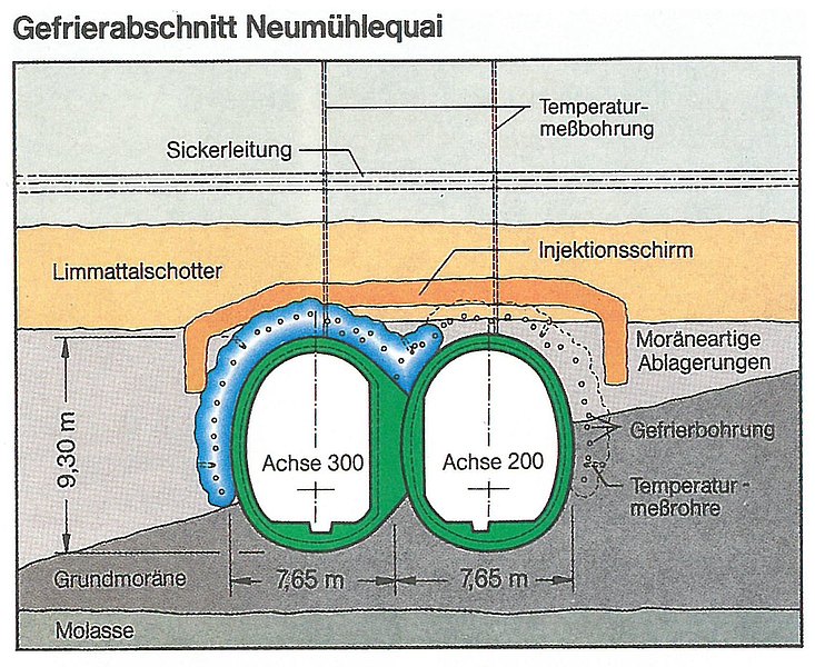 Mit dem Ausbau des S-Bahn-Netzes in Zürich wurde der zweigleisige Tunnel unter der Limmat im Schutze eines Gefrierkörpers bergmännisch aufgefahren, ebenso wie die sich daran anschließenden tangierenden eingleisigen Tunnel unter dem Neumühlequai. Die wesentlichen Vorteile des Gefrierverfahrens waren: