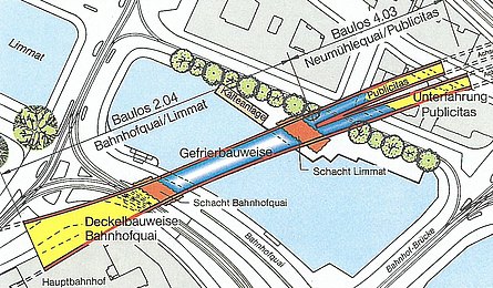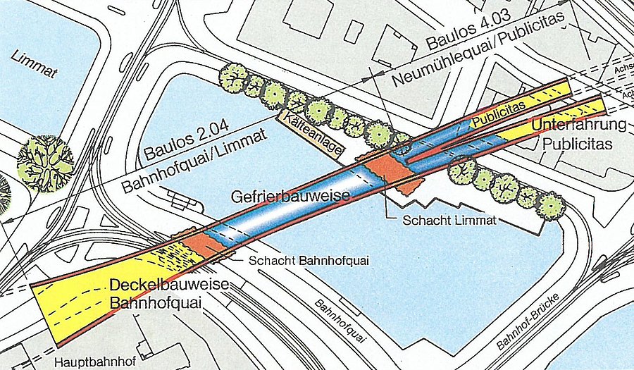Der Tunnel unter der Limmat ist bis zu 15 m breit und 10m hoch. Die Überdeckung bis zur Flusssohle beträgt 2,5 bis 3,5 m. Die bis zu 40 m langen Gefrierrohre wurden durch zielgenaues Bohren gegen drückendes Grundwasser eingebaut. Unter Auffüllungen stehen heterogene zusammengesetzte Schichten aus moränenahen Limmatschottern und Seeablagerungen an, die bis zum Neumühlequai hin stark ansteigen. In 10 bis 20m Tiefe folgen Moräne, Grundmoräne und schließlich die Felsoberfläche der Süßwassermolasse. Die angetroffenen Verhältnisse unterschieden sich in einigen Bereichen erheblich. Zur Verringerung der Grundwasserströmungen im Limmattalschotter mussten Spundwände entlang des Tunnels bis in die als dicht prognostizierten Seeablagerungen gerammt werden. Zwischen den Spundwänden wurden zusätzliche Rüttelstopfverdichtungen ausgeführt. Wegen der sehr geringen Überdeckungen zur Flusssohle musste der Wärmeaustausch zur Limmat durch eine thermische Isolation aus Hartschaumplatten begrenzt werden. Um ein Unterströmen zu verhindern, wurde der Spalt zwischen der Flusssohle und diesen Platten mit Colcrete-Mörtel verpresst. Grundwasserströme mussten erst durch Injektionsschirme über den beiden eingleisigen Tunneln abgedämmt werden, ehe der Gefrierkörper aufgebaut werden konnte. Die Temperaturen in den Gefrierkörpern wurden durch eine große Anzahl von Messfühlern überwacht. Geologisch bedingte Undichtigkeiten konnten durch Ultraschallmessungen lokalisiert und mit Injektion geschlossen werden.
