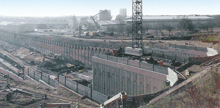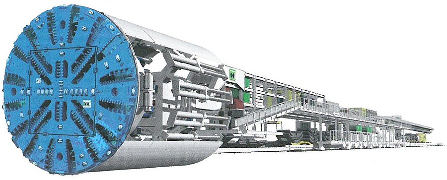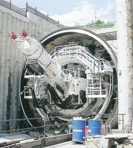 The Deutsche Bahn AG is engaged in upgrading the so-called Rheintalbahn between Karlsruhe and Basle from a 2 to a continuous 4-track route. The route is part of the Trans-European Network (TEN), which is of high international significance and serves as the main access line to the Gotthard Base Route (NEAT), which is currently being constructed. The largest individual structure along this route is the 2-tube Katzenberg Tunnel with a length of 9,385 m, on which 8,964 m is produced by trenchless means. The tunnel is designed to cope with trains travelling at speeds of up to 300 km/h. The tunnel's maximum overburden amounts to 110 m. Apart from quaternary covering layers at the tunnel's entrance zones, mainly tertiary sedimentary rocks such as mudstone, silt and occasionally sandstone in varying stages of weathering were encountered during the exploration phase. The rock strength is low. in the southern tunnel section Jura massive limestone formations have to be penetrated over a length of some 800 m. Filled karstified structures that present no problems in tunnelling terms are expected especially in the transition zones to the tertiary. The southern pre-cut with a total length of 320 m has been produced in the meantime. Overlapping drilled piles are used to secure the excavation in the direct proximity of the tunnelling machine, the rest constitutes Berlin-type support walls. The forefront of the pre-cut is produced in the form of sloping pit. The tunnelling machines are assembled in the pre-cut. The first machine started operating in the eastern tube in June 2005.