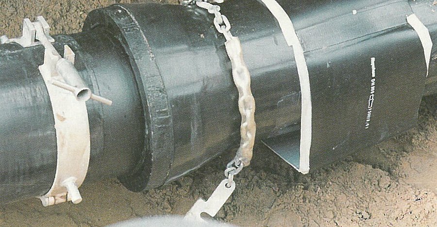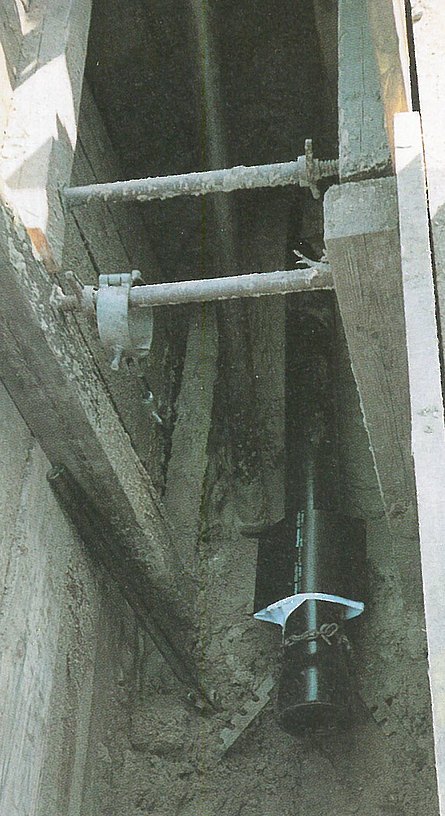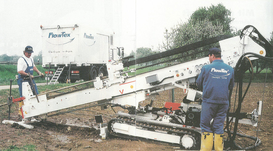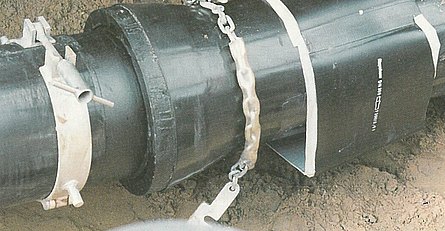 So far, the trenchless laying method has largely been used in conjunction with pipelines made of plastic. At the same time, it is also technically feasible to lay ductile cast pipes by means of the horizontal flushing bore method. Several kilometres of pipelines made of ductile cast-iron were laid by FlowTex on behalf of the Städtische Werke Krefeld AG for the City of Krefeld's water supply. Standard boring units with maximum tensile forces of 50 and 80 kN were employed for installing the inner-urban lines with diameters of DN 100, DN 150 or DN 200. For part-sections between 100 and 180 m, in each case the pilot bore was undertaken from the starting pit, the expansions carried out from the rear and the cast line drawn in during the final expansion stage. The length of the part-section in question depends on the local conditions as well as the nature of the soil. The entire route was investigated via geo-radar before boring work with the FlowTex method began. The prerequisite for installing ductile cast pipes by means of the horizontal flushing bore method is a tension-proof connection of the cast pipes. For the construction measures in Krefeld, Tyton-Sit and TKF sleeve joints from Thyssen Guss AG were selected. The cast pipes were connected within the pit. For this purpose, the 6 m long part-sections were gradually lowered into the pit, connected with Sit rings, welded with heat-shrinkable sleeves and drawn in one by one. The starting pits for drawing in the pipes must be geared in terms of length to the dimensions of the pipe part-sections and, as a consequence, are somewhat larger than conventional pits. The tensile forces that occur during the drawing-in process mainly act on the expansion head, which is directly attached to the rod. Through the sliding action and the buoyant effect, resulting from the bore suspension, the pipeline is drawn in without any friction worth mentioning. For laying ductile cast pipes with an internal diameter of 300 mm outside the city area, a more powerful boring system with a tensile force of 100 kN was used. Here, an expansion of the borehole to 580 mm was necessary. For the pilot bore, expansion and drawing in of the product pipe, 4 working days were required for the section.