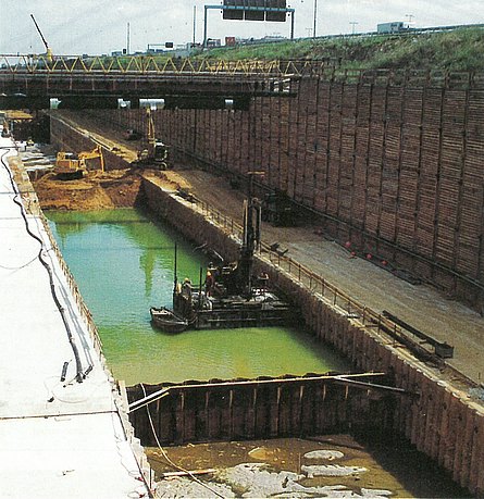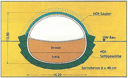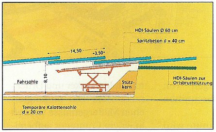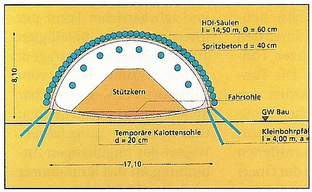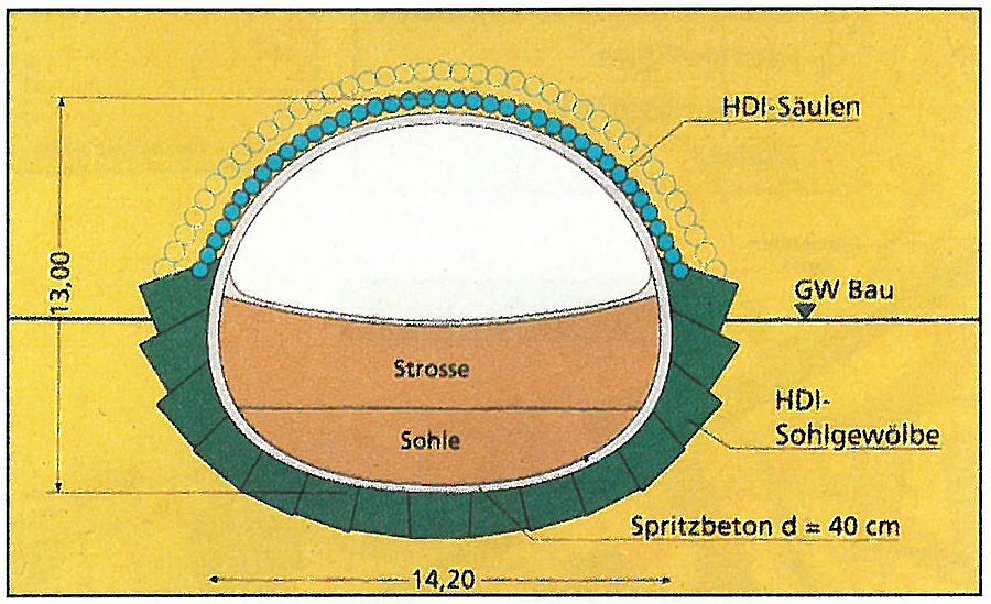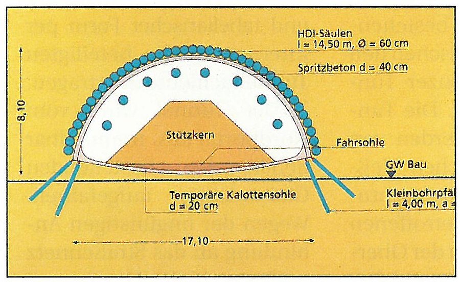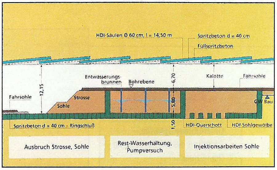 The route of the Deutsche Bahn AG new Cologne-Rhine/ Main line passes beneath the A 3 and A 5 motorways at the Frankfurter Kreuz hub. The Frankfurter Kreuz is one of Europe's busiest free-ways. Thus a heading method had to be selected, which ensured that the permissible surface settlements were adhered to given tricky geology and extremely thin overcapping (8 to 15 m) without closing down traffic. The subsurface is largely composed of quaternary sands and gravels, which markedly interchange to a pronounced degree. The groundwater level lies roughly 20 m beneath the surface arid in turn up to 6 m above the tunnel base. Taking these conditions into consideration, a circular tunnel cross-section was chosen, which with a height of 13 m and 15 m in width, possesses a very large excavated cross-section of 150 m². It was decided to drive the crown protected by an advance HDBV screen. The bench and base had to be created protected by a HDBV trough as the groundwater could not be lowered over a large area. The actual crown drive was undertaken protected by this screen with a length of advance of 1 m. The face was additionally supported by means of a wedge, HDBV columns and through installing shotcrete. Roughly 60 m behind the face, the bench and base HDBV zones were created from the crown base. After the bench and base HDBV zone was completed, extraction ensued with a 40 cm shotcrete support and 2 layers of structural steel lattice installed. On account of the significance of the construction measure and the safety requirements, a far-reaching measurement programme was installed. It ensured fully automatic continuous monitoring of the surface Settlements (24 h per day) with a total of 70 measuring points. The data were transferred online to the measuring centre and evaluated. Control measurements were undertaken parallel to this in order to supervise the fully automatic measurement system. The theoretically predicted surface settlements amounting to < 50 mm could be adhered to. After completion of the extraction work, the inner shell was installed in 10 m long blocks, using watertight concrete with an air cushion membrane as a gliding layer between the outer and inner shells.