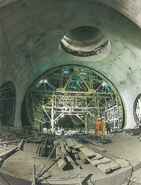 The European Research Organisation CERN built the LEP - Large Electron Positron Ring - LEP - completed in 1988 - 27 km long underground ring for accelerating, storage and collision of electrons and positrons as well as the relevant facilities for experiments. The 19.3 km long main tunnel was driven by 3 tunnel boring machines (TBMs) at depths of 50 to 140 m in molasses. Roughly every 3.4 km, test and equipment caverns as well as access shafts are set up. 5 of them are large-scale cavern facilities with a system of chambers, galleries and shafts with various diameters and dimensions. As the molasses has a strong inclination to weathering and small breaks in the roof could not be excluded, a reinforced concrete support was first of all installed. The galleries with a total length of 5,500 m have different cross-sections and were therefore driven via blasting or with road headers. In accordance with the geological conditions, various methods were selected for sinking the shafts. Only in the case of 5 shafts was it possible to install concrete rings with a wall thickness of 40 to 70 cm immediately as the final support at heights varying from 1.5 to 3 m. 6 shafts were built using curtain walls, a further 5 shafts protected by a freezing well with freezing depths up to 65 m. The caverns are connected via a large number of shafts, tunnels and lateral chambers. The cavern crowns could not be driven by blasting, in the bench and base zones up to a distance of 1 m from the excavated profile. The remainder was excavated by roadheaders.