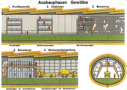 Das anstehende Gebirge lässt sich morphologisch in 2 Abschnitte unterteilen. Die etwa 70 m hohe Kuppe des Bürgerwaids im Osten wird von gebankten, stark geklüfteten und verkarsteten Dolomitsteinbänken des oberen Muschelkalks aufgebaut. Das terrassenförmige Plateau im Westen, welches ca. 40 m über der Talsohle der Wutach liegt, ist von einer geologisch kaum gliederbaren Folge eiszeitlicher Lockergesteine aus Kiessand mit lokal begrenzten Sandlinsen und massigen Nagelfluhbänken gebildet. Im tieferen Untergrund unter den wasserdurchlässigen quartären Lockergesteinen und der Auslaugungszone befinden sich Gipsgesteine des mittleren Muschelkalks. Hier setzt sich die Auslaugung fort und bildet dadurch eine unregelmäßige, sich noch ständig verändernde Auslaugungsfront im Untergrund. Die Folge sind flächige Nachsackungen oder eng begrenzte Dolineneinbrüche, die sich bis zur Oberfläche durchpausen können. Dolineneinbrüche sind an der Geländeoberfläche auf einer Länge von etwa 120 m sichtbar und im Erkundungsstollen angefahren worden. Die Ausführung des bergmännischen Tunnels erfolgt in mehreren Arbeitsgängen. Ausbruch nach der Spritzbetonbauweise, um flexibel auf die wechselhaften Gebirgsverhältnisse reagieren zu können. Der Ausbruch des Gesamtquerschnitts erfolgt in zwei Teilausbrüchen, Kalotte und Strosse. Im Lockergebirge wird zusätzlich eine ausgerundete Sohle hergestellt. In der tunnelbautechnisch ungünstigen Zone im Lockergebirge wird ein Querschnitt mit Sohlgewölbe ausgeführt. Der Ausbruch erfolgt mit Hilfe eines Hydraulikbaggers. In der Zone mit Felsgebirge erfolgt die Gebirgslösung im Sprengvortrieb. Das Gewölbe wird mit einem Unterlagsvlies und einer 2 mm dicken Kunststoffbahn gegen Bergwasser abgedichtet. Gegen diese Dichtung wird das 40 cm dicke, nur im Bereich des Lockergebirges und in Störzonen bewehrte Tunnelinnengewölbe betoniert. Das gewählte Tragwerkskonzept kann die, durch fortdauernde Auslaugung des Gipsspiegels ungleichmäßigen, Setzungen des Bauwerks ausgleichen, indem die Innenschale auf der gesamten Länge der Auslaugungszone als Gelenkkette ausgebildet wird. Die Gelenke ermöglichen eine begrenzte Verdrehung der Blöcke bei gleichzeitiger Querkraftübertragung. Die Querkraftübertragung wird durch einen Nut-und-Feder- Konstruktion sichergestellt. In der Firste jeder Fuge wird deren Bewegung durch Wegmesseinrichtungen (induktive Wegaufnehmer) registriert und die frühzeitige Erkennung von Lageänderungen der Tunnelröhre damit gewährleistet.