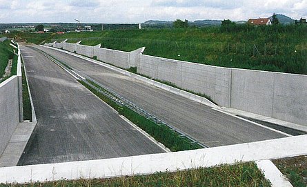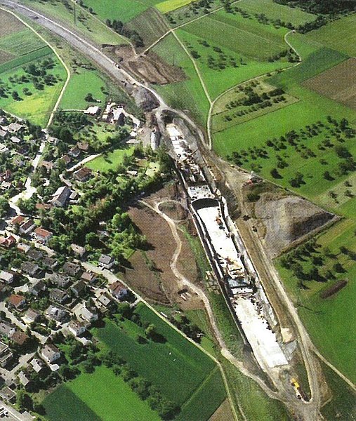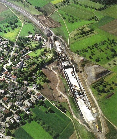 Im Zuge des Ausbaus der Bundesstraße 10, Göppingen-Gingen, wurde zum Schutz der nahe liegenden Wohnbebauung ein Tunnel erforderlich. Die Fahrbahnoberkante taucht bis zu 5 m in den Grundwasserhorizont ein, deshalb erfolgte der Tunnelbau mit wasserdichter Grundwasserwanne. Der Trogquerschnitt hat eine lichte Breite von 24,8 m. Die langen Rampenwände werden durch dreieckförmige Pflanznischen, strukturierte Wandoberflächen und Pflanzgitter gestaltet. Der Tunnel besteht aus einem zweizelligen Rechteckquerschnitt mit jeweils 1 m breitem Notgehweg. Die lichte Höhe im Tunnel beträgt 4,8 m. An den nördlichen Tunnelportalen ist ein Betriebsraum für die elektrische Ausrüstung angeordnet. Das oberflächennahe Trog- und Tunnelbauwerk wurde in offener Bauweise in geböschter Baugrube hergestellt. Die Sohle des Trog- und Tunnelbauwerkes verläuft im Tunnelbereich und im Bereich der östlichen Rampe in einer Schicht aus Tonsteinen und Tonmergelsteinen des Schwarzjura. Diese Schichten werden überlagert von Verwitterungslehmen und Hangschuttmassen stark unterschiedlicher Mächtigkeit. Im Bereich der westlichen Rampe verläuft die Sohle im unteren Schwarzjuramergel mit eingelagerten Mergelkaik- und Kalksteinbänken. Das Trog- und Tunnelbauwerk wurde aus wasserundurchlässigem Beton nach dem Prinzip der „ Weißen Wanne" hergestellt. Tunnel- und Trogbauwerk wurden, da im Grundwasser liegend, im Sohle-Wandbereich monolithisch hergestellt. Die Tunneldecke wurde im Anschluss an die fertiggestellten Sohle-Wand-Abschnitte aufbetoniert. Die Blocklänge wurde mit 10 m festgelegt. Im Zuge der Baumaßnahme wurde die Verlegung des Streichenbaches erforderlich. Nach Fertigstellung des Tunnels wurde der Streichenbach über die Tunneldecke zu einem neuen Regenrückhaltebecken östlich der Bauwerkstraße geführt.