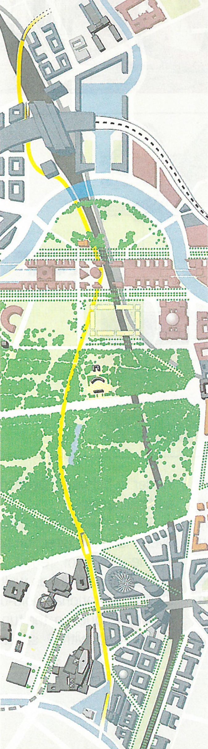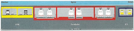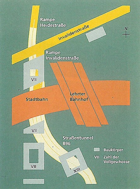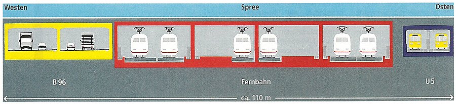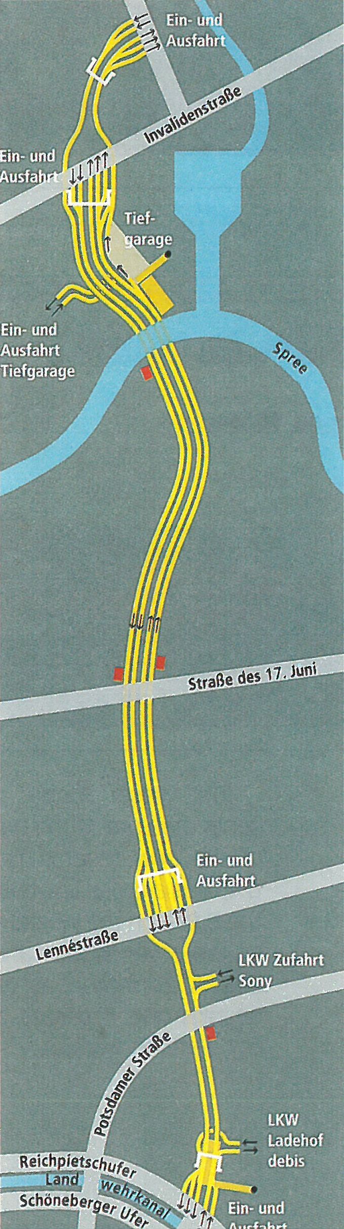 Zur Bewältigung der Verkehrsaufgaben in Berlin müssen neben dem Wiederaufbau des Bahnnetzes auch neue Lösungen zur Führung des Straßenverkehrs gefunden werden. Für das geplante Parlaments- und Regierungsviertel im Spreebogen, dem neuen Entwicklungsschwerpunkt zwischen Lehrter Bahnhof und Potsdamer Platz wird mit den neuen, überwiegend unterirdisch verlaufenden Schienenverkehrsanlagen im Zentralen Bereich die ebenerdig in Nord-Süd-Richtung verlaufende Bundesstraße B 96 den zukünftigen Entwicklungen von Verkehr und Städtebau entsprechend durch einen Tunnel ersetzt. Technisches Kernstück ist ein 2,4 km langer Straßentunnel mit vier Ein- und Ausfahrtrampen. Der Hauptabschnitt weist in jeder Fahrtrichtung zwei Fahrstreifen und einen Standstreifen mit einer lichten Tunnelbreite von 10,50 m auf. In den nördlichen und südlichen Tunnelstrecken sowie in den Rampenstrecken wird der Fahrstreifenanteil erhöht und damit den Erfordernissen des Verkehrs angepasst. Etwa 5000 Fahrzeuge stündlich werden diesen Tunnel maximal durchfahren, der Tageswert wird bei etwa 60 000 Fahrzeugen liegen. Als weitere wesentliche Elemente sind vorhanden: