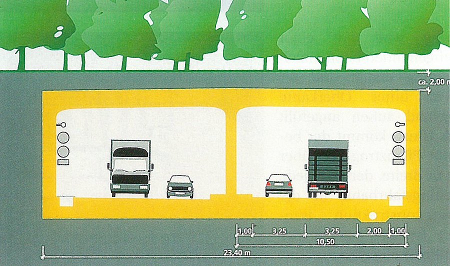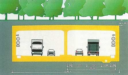 - Regelquerschnitt: Lichte Höhe 5,0 m, Lichte Breite 10,5 m; Stahlbetonrahmenbauwerk mit 2 durch eine Mittelwand getrennte Röhren
