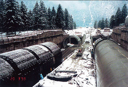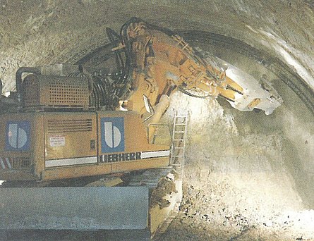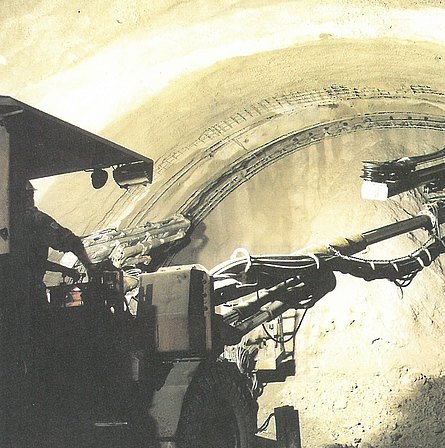 Das endgültige Tragsystem, die Betoninnenschale, wurde später nachgezogen. Im Felsbereich erfolgte ein Sprengvortrieb in der Kalotte mit Abschlagslängen von 1,0-2,5 m. Bei durchschnittlich vier Abschlägen pro Arbeitstag von 24 Stunden konnte so eine Vortriebsleistung von ca. 6-10 m arbeitstäglich erreicht werden.
