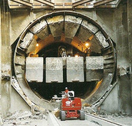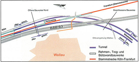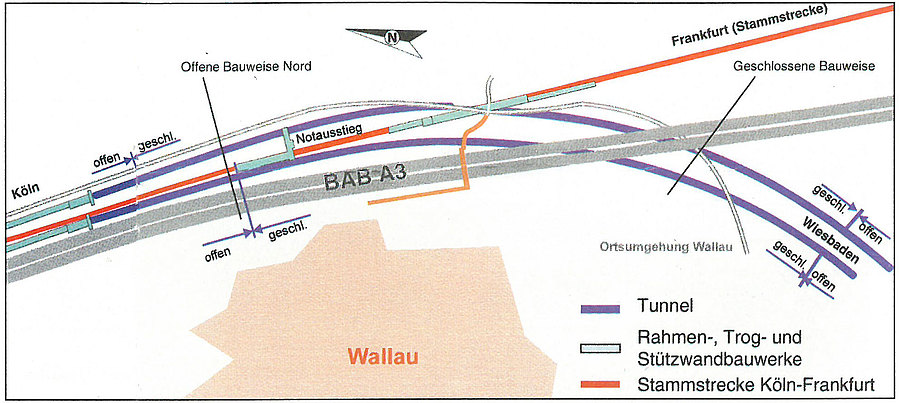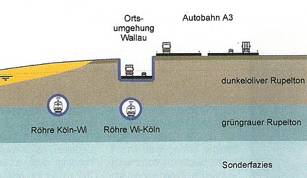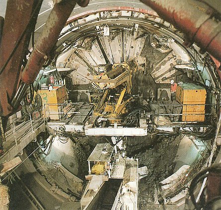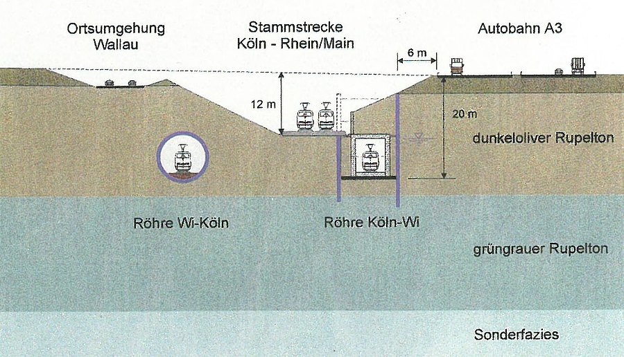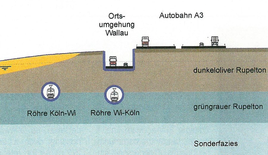 Im Rahmen der ICE-Neubaustrecke Köln-Rhein/Main dient der Tunnel Wandersmann Nord der Anbindung von Wiesbaden an die Hauptstrecke. Die beiden eingleisigen Tunnelröhren unterqueren die Autobahn A3 mit einer Überdeckung von rund 20 m. Die Randabschnitte der beiden eingleisigen Tunnel werden als Rechteckquerschnitte in offener Bauweise erstellt, die Mittelabschnitte werden mit einer Schildmaschine mit teilgestützter Ortsbrust im 24-Stunden-Dekadenbetrieb aufgefahren. Der Schild hat ein Gesamtgewicht von rd. 460 t und wird von 25 Pressen (Gesamtkraft 70 000 kN) vorgedrückt. Die wasserdurchlässige Tübbingaußenschale (d = 30 cm, B 45) dient nur als Baubehelf bis zum Einbau der druckwasserdichten Stahlbetoninnenschale (d = 45 cm, WU-Beton B 25/B 35 sulfatbeständig) und wird im Endzustand nicht angesetzt. Der Baugrund besteht aus tertiärem Rupelton, der von den Sonderfazies des Oligozäns unterlagert wird. Der Rupelton untergliedert sich in ein oberes Schichtpaket mit dunkeloliver Farbe und halbfester bis fester Konsistenz, das durch vertikale Kleinklüfte und durch in die Ortsbrust einfallende Gleitungsklüfte geprägt ist, sowie in ein weitgehend strukturloses unteres Schichtpaket mit grüngrauer Farbe und etwas geringerer Konsistenz. Grundwasser ist sowohl in dem klüftigen dunkeloliven Rupelton als auch in gespannter Form in den Sonderfazies vorhanden. Der grüngraue Rupelton stellt den Wasserstauer dar. Beim Öffnen der Anfahrwand zeigten die umgelagerten Böden ein so aufgelockertes und kleinstückiges Gefüge, dass der Anfahrbereich im Schutze einer Bodenvereisung mit flüssigem Stickstoff durchörtert werden musste. Während des Vortriebs der ersten Röhre kam es infolge der engständigen Klüftung und der hohen Konsistenz des dunkeloliven Rupeltons in Teilbereichen zu Beeinträchtigungen der Ortsbruststandfestigkeit, da der Boden vom Druck der Schildschneide örtlich unerwartet kleinstückig zerlegt wurde. Diese neue Erkenntnis zum Bodenverhalten wurde vor dem Anschlag der zweiten Röhre durch verschiedene Umbauten der Schildmaschine umgesetzt.