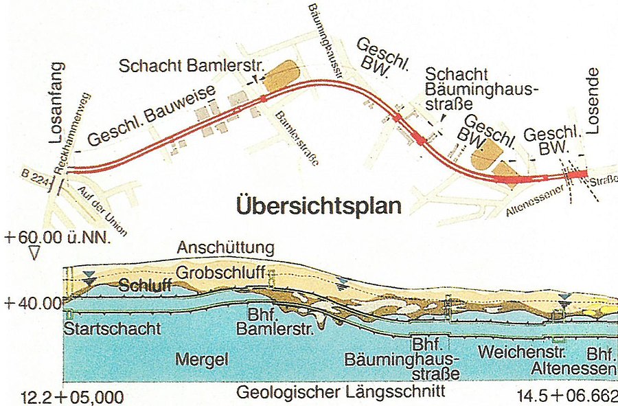 Die geologischen Verhältnisse im Essener Norden mit hohem Grundwasserstand, stark wechselnden Höhen der einzelnen Bodenschichten des Mergels und wassergesättigten Schluffen mit organischen Bestandteilen und Schlammeinlagerungen zwangen dazu, einen Schildvortrieb nach dem Erddruckprinzip für den Streckenbereich im Tunnel und die Spritzbetonbauweise unter Druckluft im Bahnhofsbereich anzuwenden. Es wurden zwei parallel geführte eingleisige Streckentunnel mit einer Gesamtlänge von ca. 3,4 km aufgefahren. Als vorläufiger Ausbau des Tunnels wird Extrudierbeton gewählt. Der Erddruckschild hat einen Durchmesser von 7,12 m. Das Schneidrad ist funktionsbedingt weitgehend geschlossen und im Zentrum mit zwei Kämmen ausgebildet, die mit Werkzeugen bestückt sind. Im Schneidrad integrierte Klappen gewährleisten, es vollkommen zu verschließen. Nur wenn ein Überdruck in der Erddruckkammer vorherrscht, ist der Erdaustrag gegeben. Dadurch ergibt sich eine gleichmäßige Beanspruchung der Ortsbrust beim Abbau und somit ein setzungsarrner Vortrieb. Ein weiteres wesentliches Mittel zur Reduzierung der Setzungen ist die im Schildschwanz hergestellte Tunnelauskleidung aus Extrudierbeton mit 30 cm Dicke. Sie sichert den aufgefahrenen Hohlraum. Der Beton wird bei diesem Verfahren über mehrere gleichmäßig beschickte Füllöffnungen in einen ringförmigen Raum am Ende des Schildes gegen das umgebende Gebirge gepresst. Durch die besonderen Eigenschaften dieses hoch fließfähigen Extrudierbetons werden das anstehende Gebirge und auch der Wasserdruck bereits im flüssigen Zustand des Betons zuverlässig gestützt. Durch den hohen Druck beim Einbau des Betons kann dieser wie eine hydraulische Presse genutzt werden, so dass Auflockerungen und Entspannungen des umgebenden Gebirges aus dem Schildvortrieb zumindest teilweise wieder ausgeglichen werden. Durch die dabei erzielte Vorspannung des Bodens wird gleichzeitig eine innige Verzahnung zwischen dem Gebirge und der Betonaußenschale sowie eine ideale Bettung der Tunnelröhre erreicht. Im Bahnhofsbereich hat die Innenschale eine Dicke von 35 cm. Sie wird aus Stahlfaserpumpbeton hergestellt. Da jedoch der Stahlfaserbeton für die Tunnelinnenschale kein allgemein zugelassener Baustoff war, wurde nach intensiven Vorversuchen mit anschließenden Genehmigungsverfahren eine Zulassung im Einzelfall gemäß BO Strab und Tunnelbaurichtlinien erreicht.